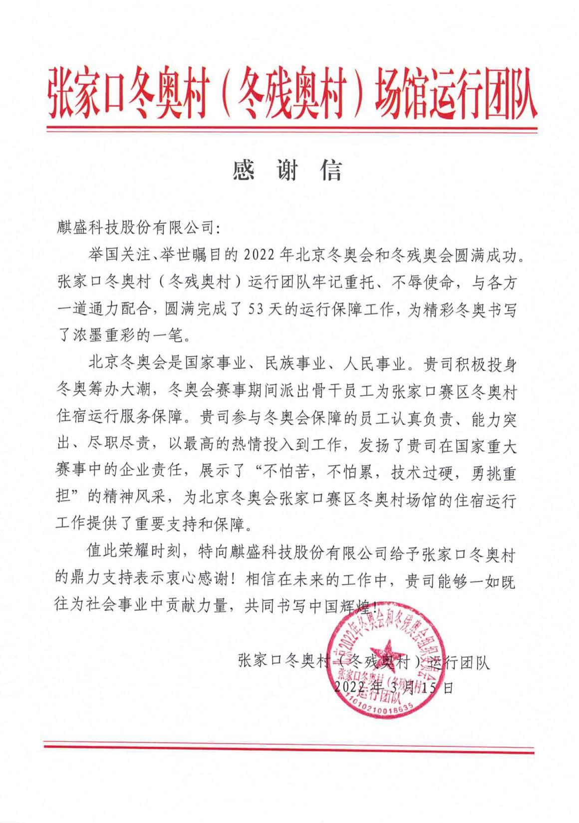 日前,J9团体|国际站官网备用科技股份有限公司收到了来自张家口冬奥村(冬残奥村)运行团队的一封谢谢信——