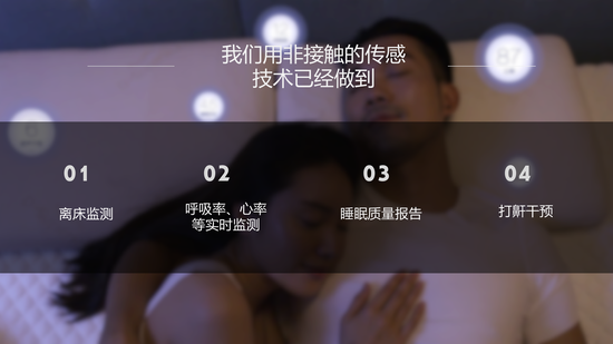 人躺在厚厚的床垫上,与传感器相隔50cm的距离,传感器依然可以监测和捕捉到人的每一次翻身、呼吸、心跳和打鼾的体征数据。